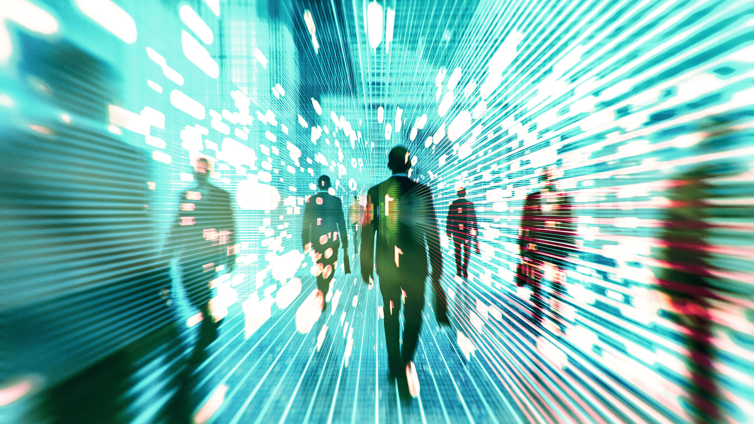 turquoise futuristic image of abstract people walking
